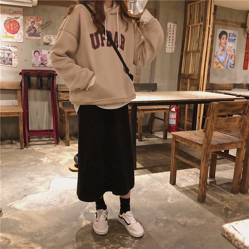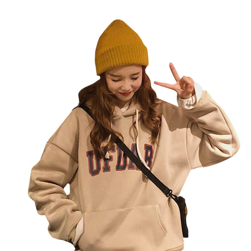 2018新款秋冬韓版復古慵懶風寬松字母連帽加絨加厚衛衣上衣外套女