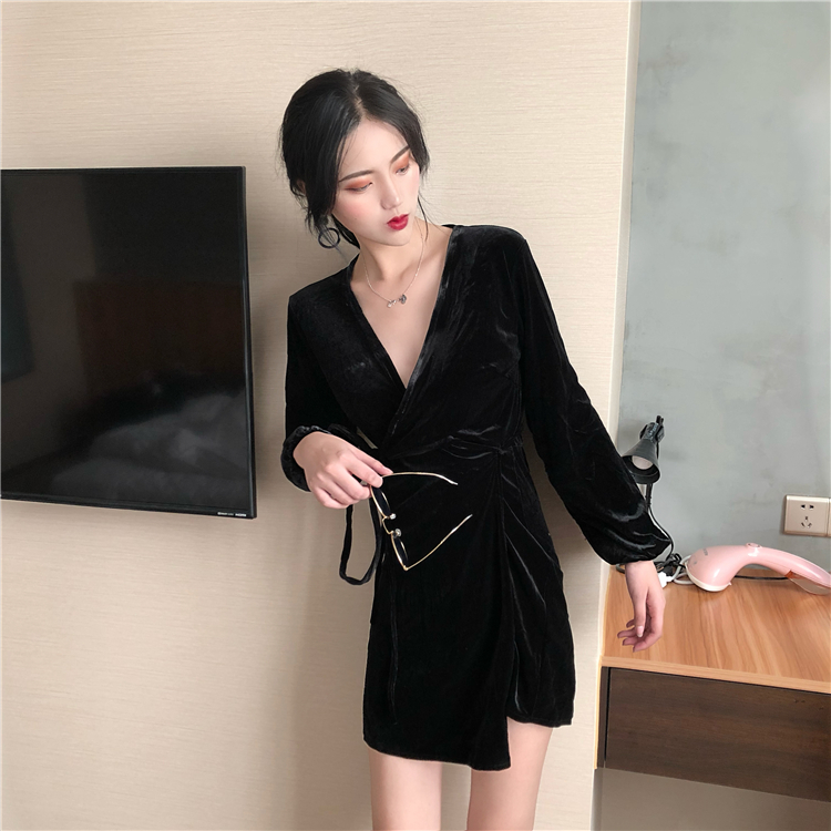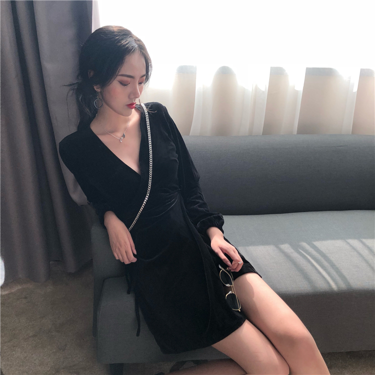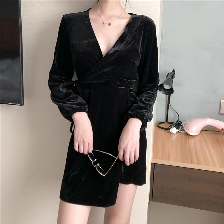 2018秋裝新款韓版裙子女時尚絲絨復古V領顯瘦高腰系帶長袖連衣裙