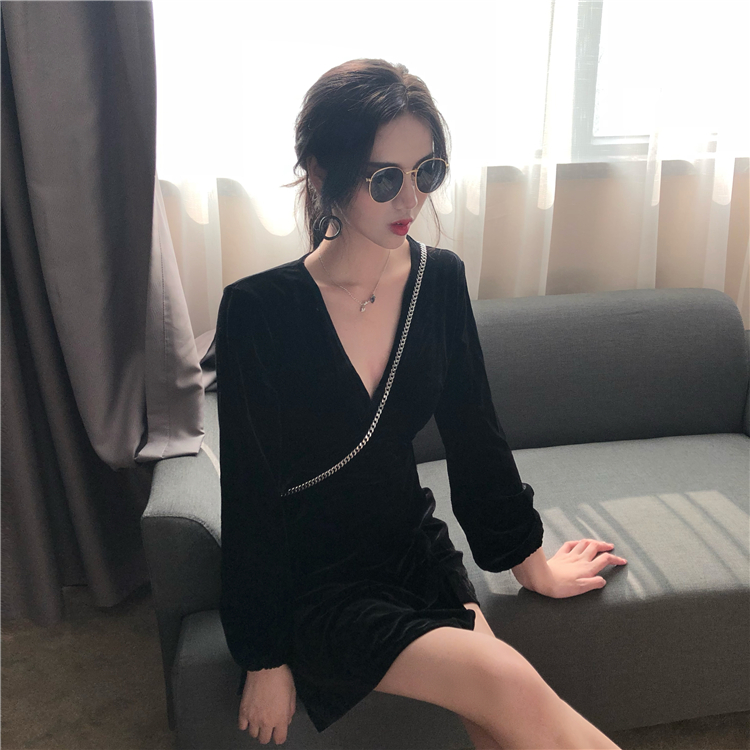 / 2018秋裝新款韓版裙子女時尚絲絨復古V領顯瘦高腰系帶長袖連衣裙
