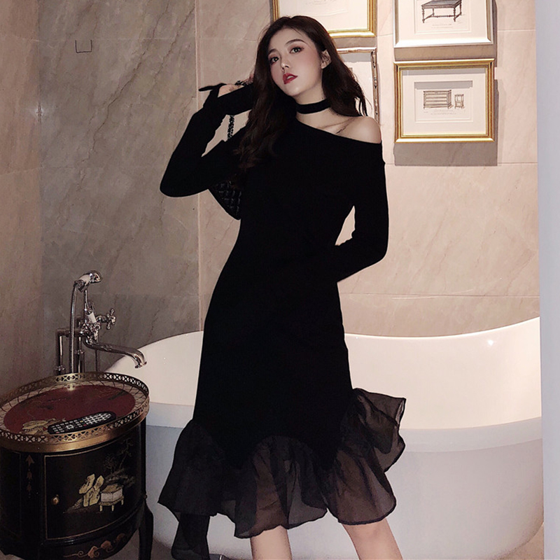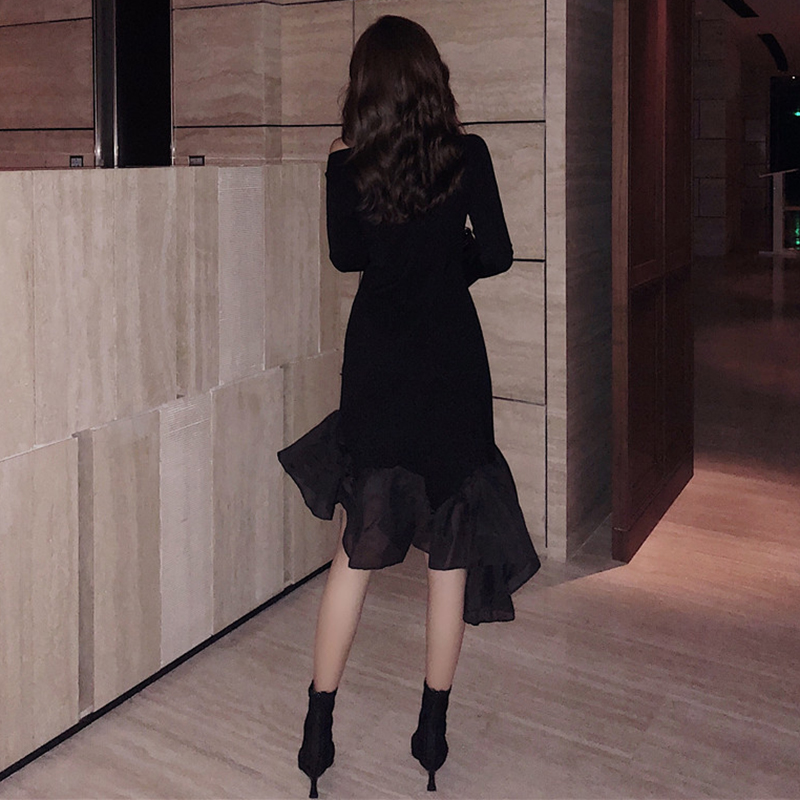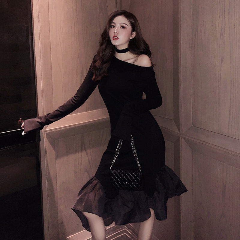 / 時尚露肩長袖修身顯瘦小黑裙秋裝女2018新款氣質不規則魚尾連衣裙