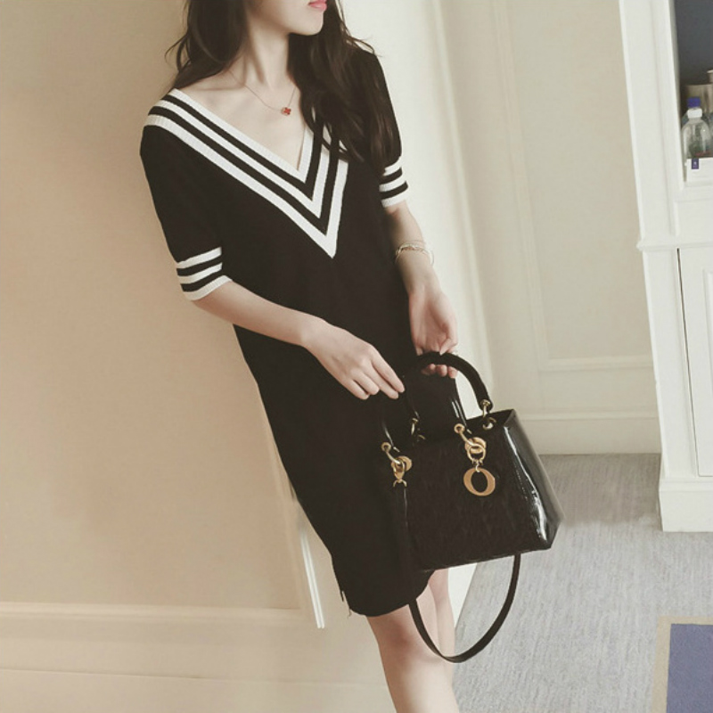 / 春秋裝新款韓版中長款拼接條紋V領長袖打底衫針織衫連衣裙女
