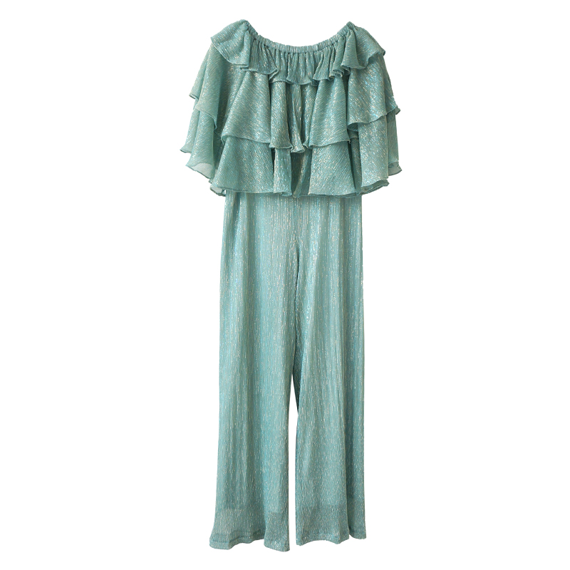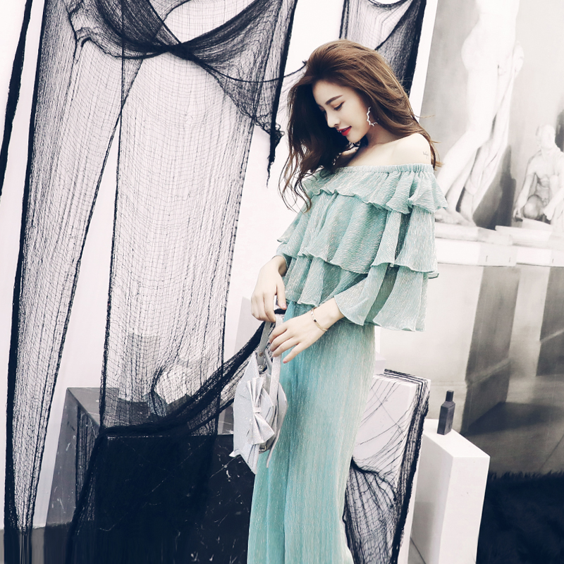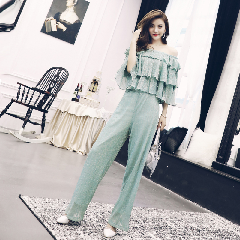 / 歐洲站2018新款夏裝歐貨潮休閑一字肩短袖亮絲T恤闊腿褲兩件套裝