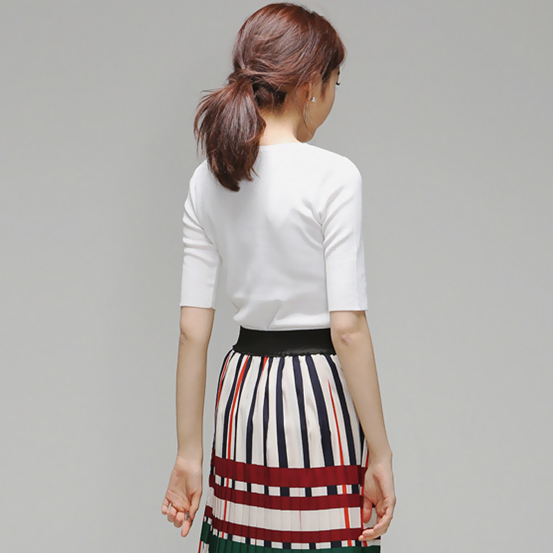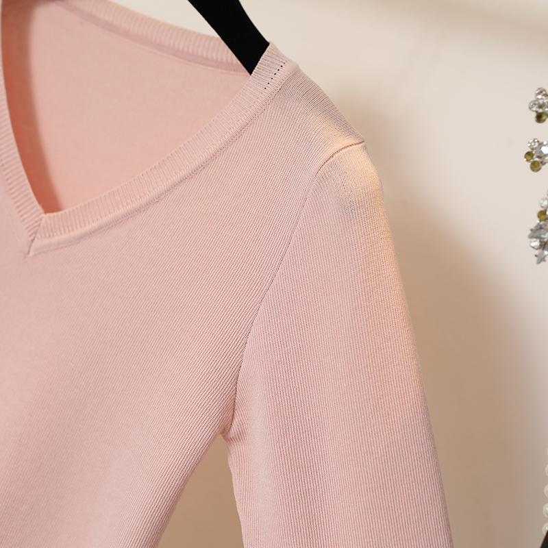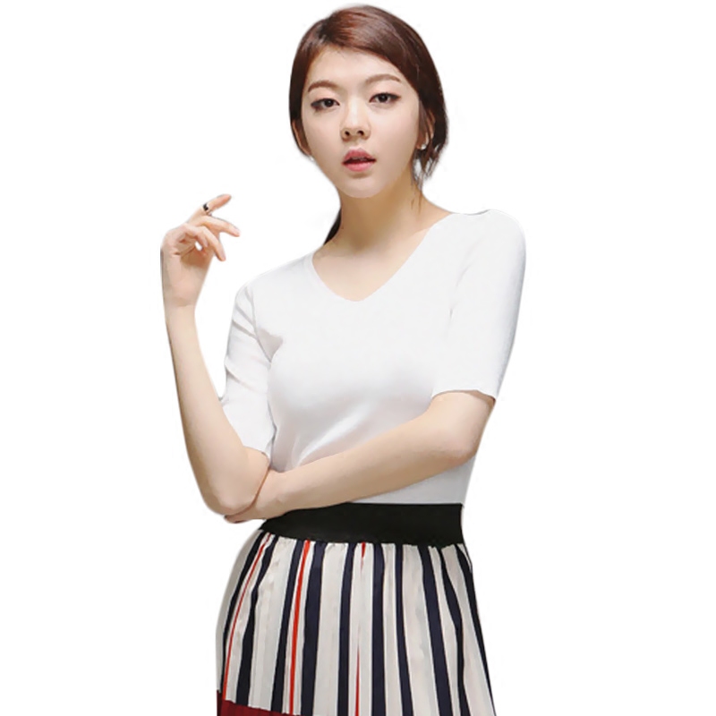 針織短袖女夏冰絲v領純色修身白色t恤女薄新款韓版百搭打底衫