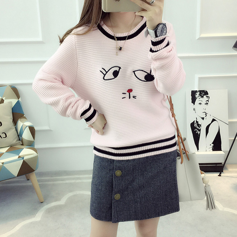 / 套頭毛衣女學生韓版短款圓領長袖針織衫春裝新款女裝刺繡上衣