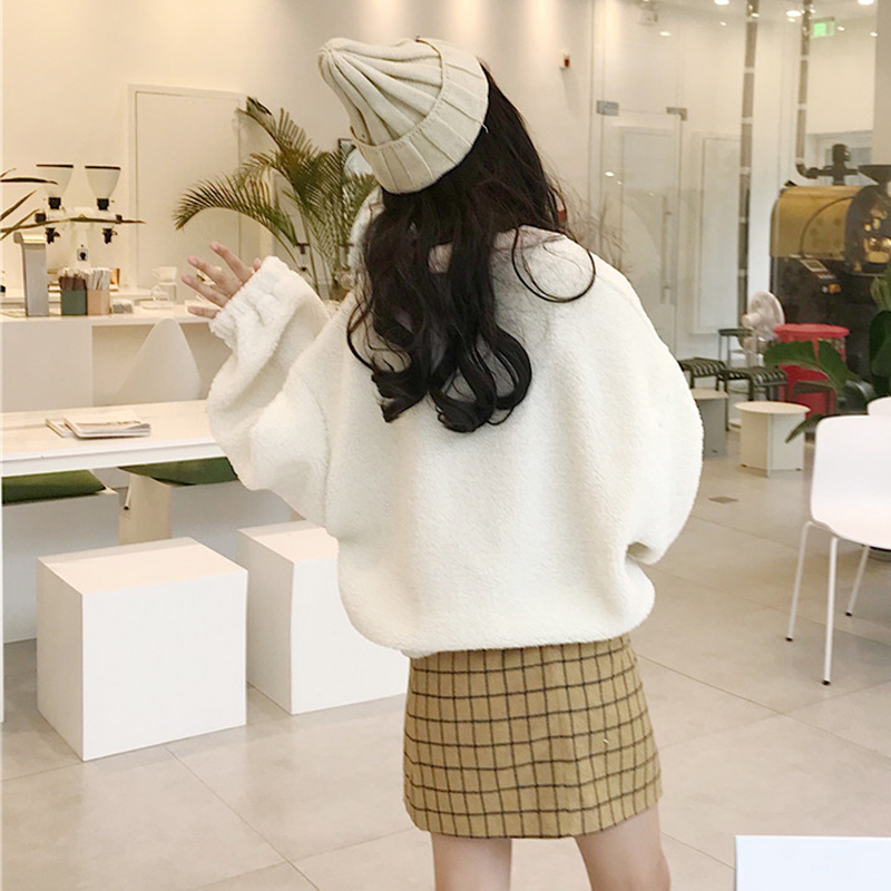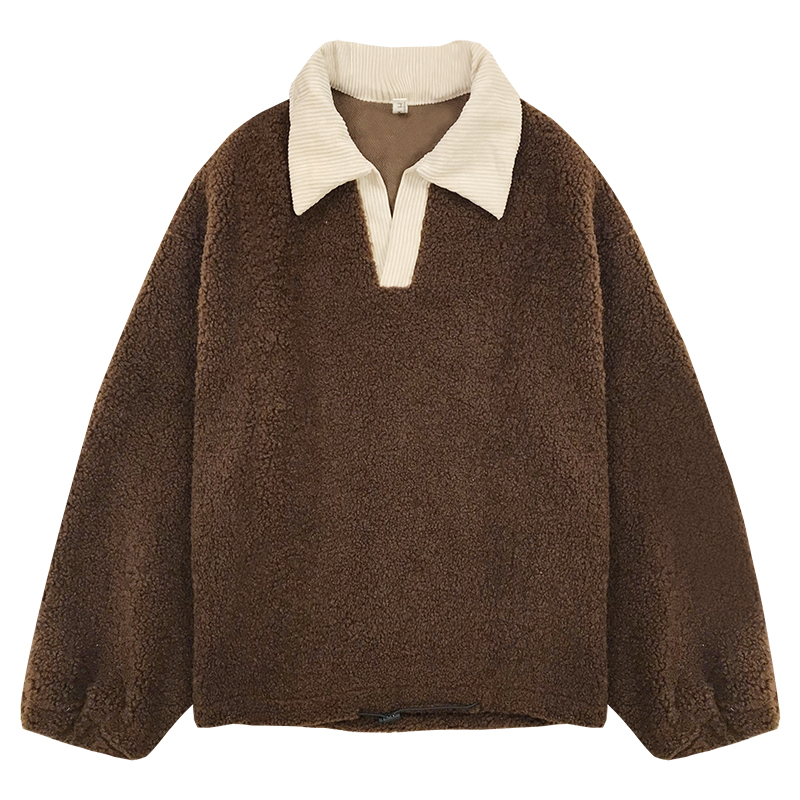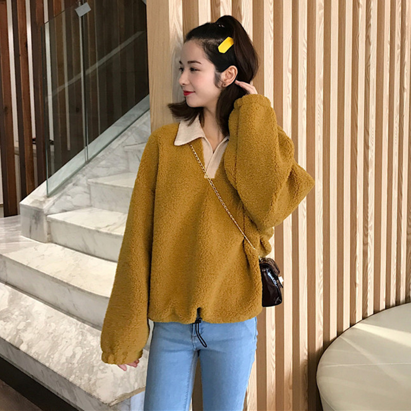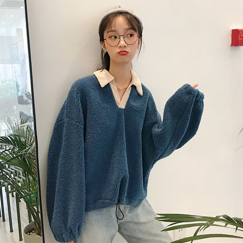 / 秋冬女裝新款羊羔毛上衣學生韓版百搭撞色V領長袖套頭衛衣外套潮
