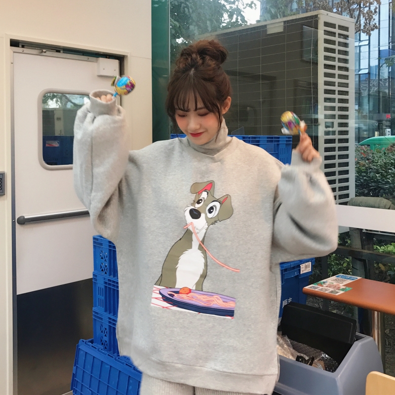 / 秋冬女裝韓版慵懶風寬松原宿風卡通加絨加厚高領套頭衛衣上衣外套