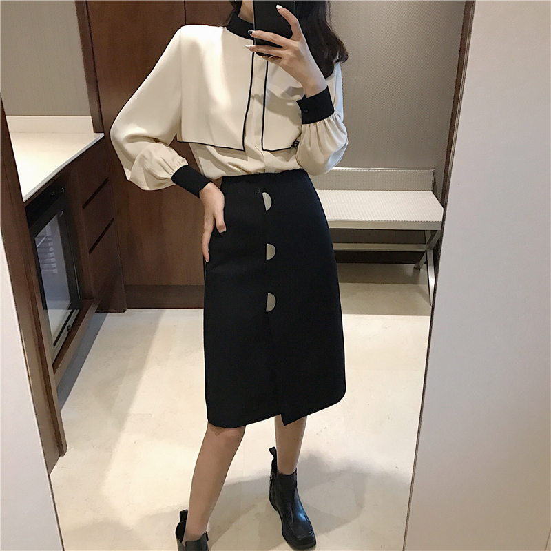 / 新款立領撞色披肩長袖襯衣時尚套裝半圓金屬扣百搭半身裙兩件套女