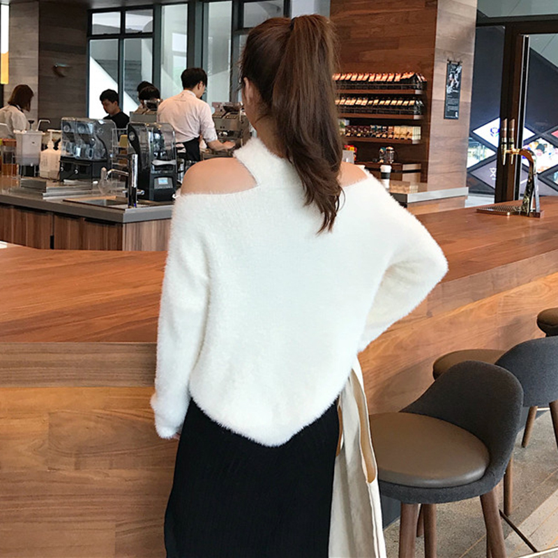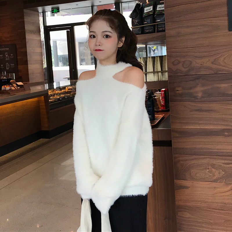 / 慵懶風露肩掛脖套頭毛衣秋冬新款女裝休閑寬松純色毛絨絨長袖外套
