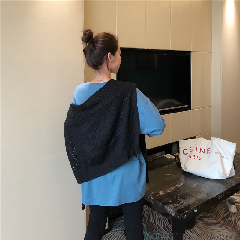 白色T恤|藍色T恤|黑色披肩|黑色打底褲|灰色打底褲
