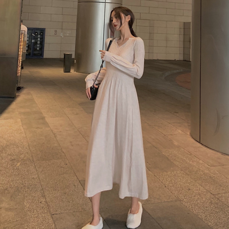 秋冬裝2018新款高腰顯瘦氣質針織連衣裙法式少女egg風V領小黑裙子