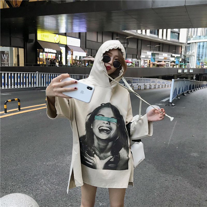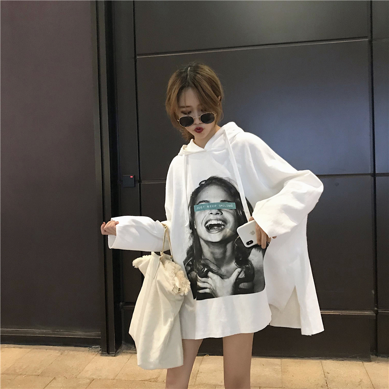 秋季女裝2018新款韓版中長款原宿風寬松復古人物連帽超火衛衣外套