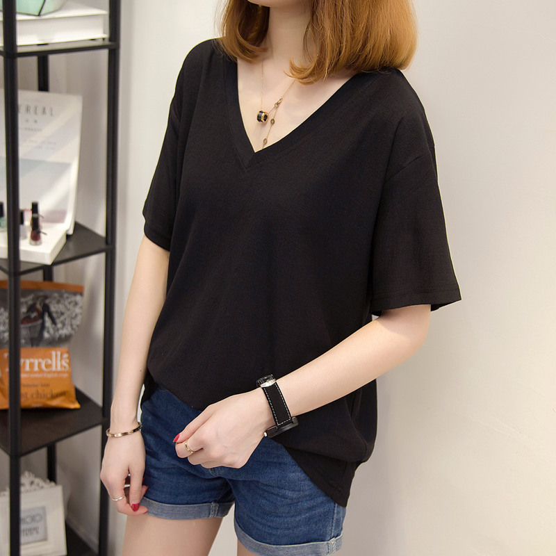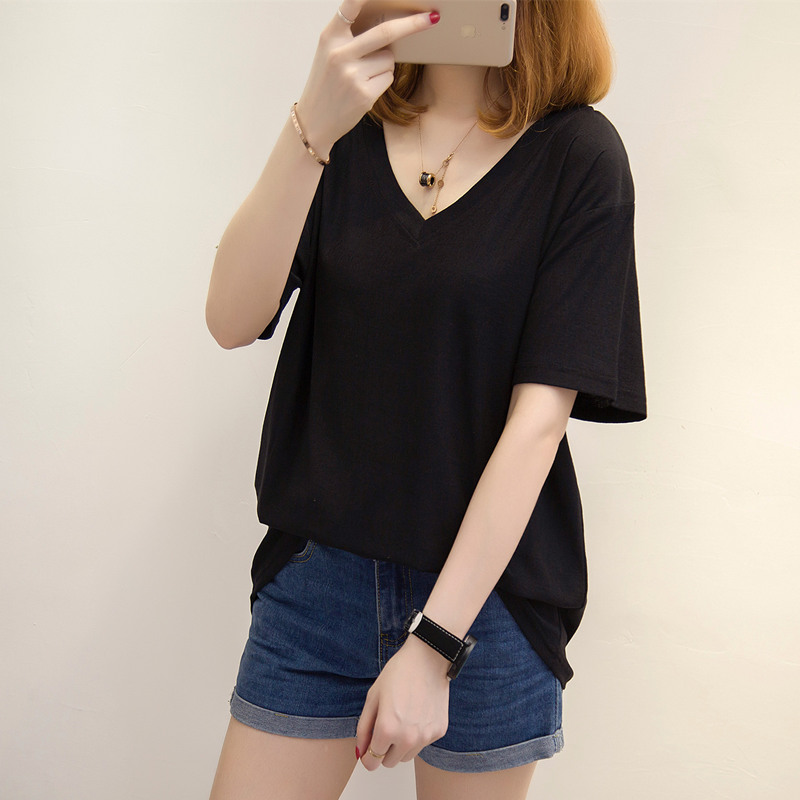 夏裝新款女上衣純色V領寬松白色bft恤女短袖衣服女夏體恤衫潮