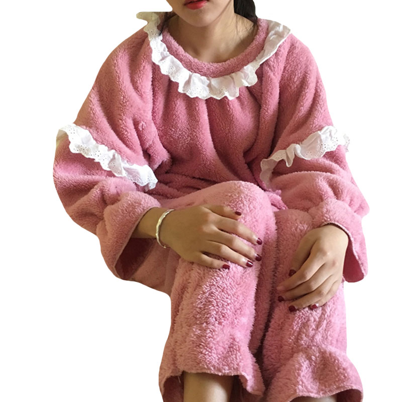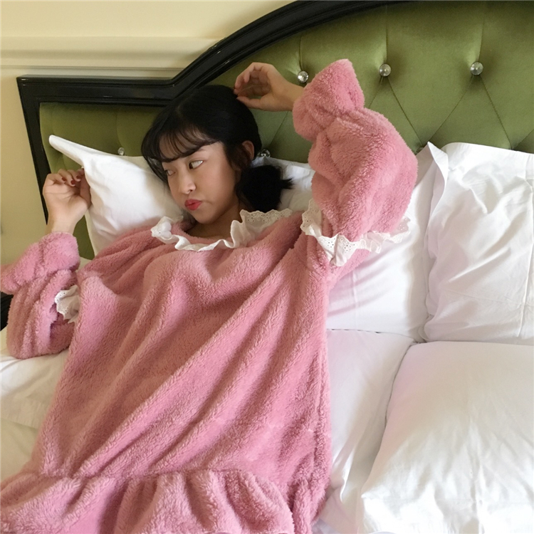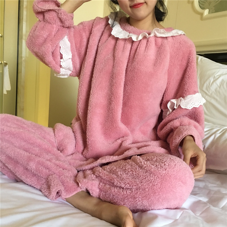 / 秋冬韓版可愛甜美珊瑚絨花邊睡衣睡褲兩件套學生休閑家居服套裝女