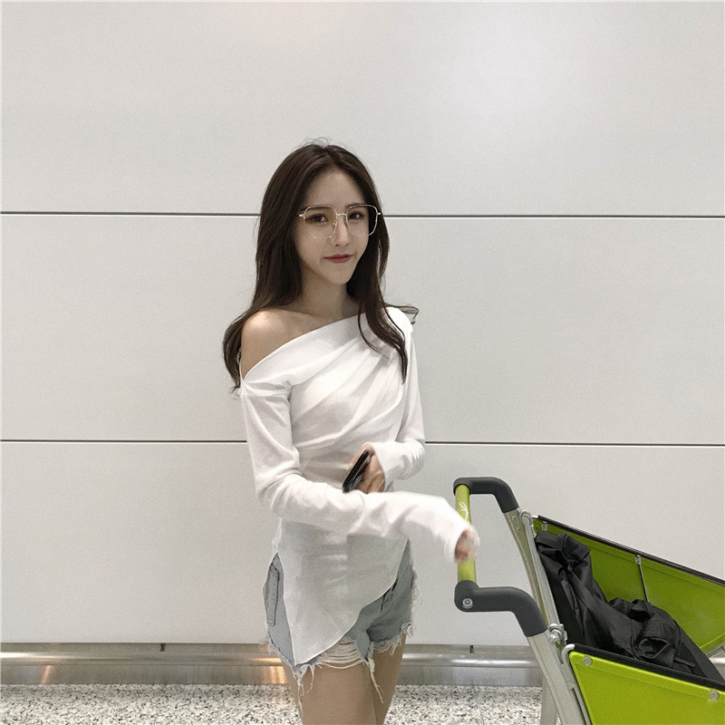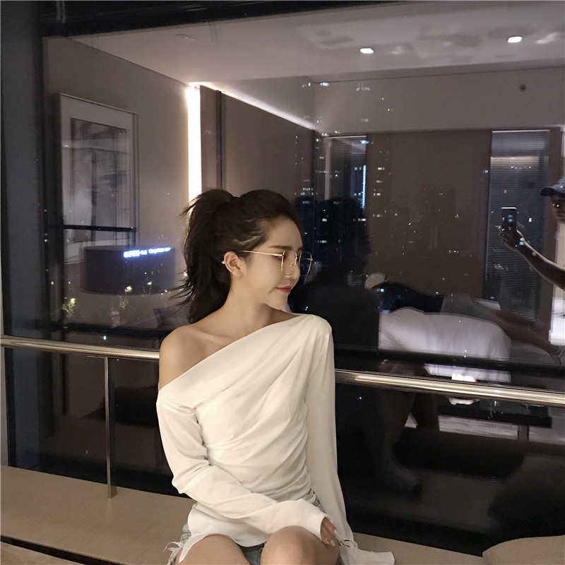 / 秋裝女2018新款百搭一字肩上衣小心機露肩長袖體恤漏肩內搭打底衫
