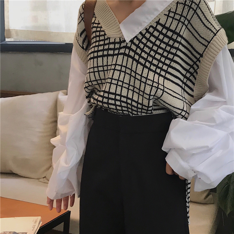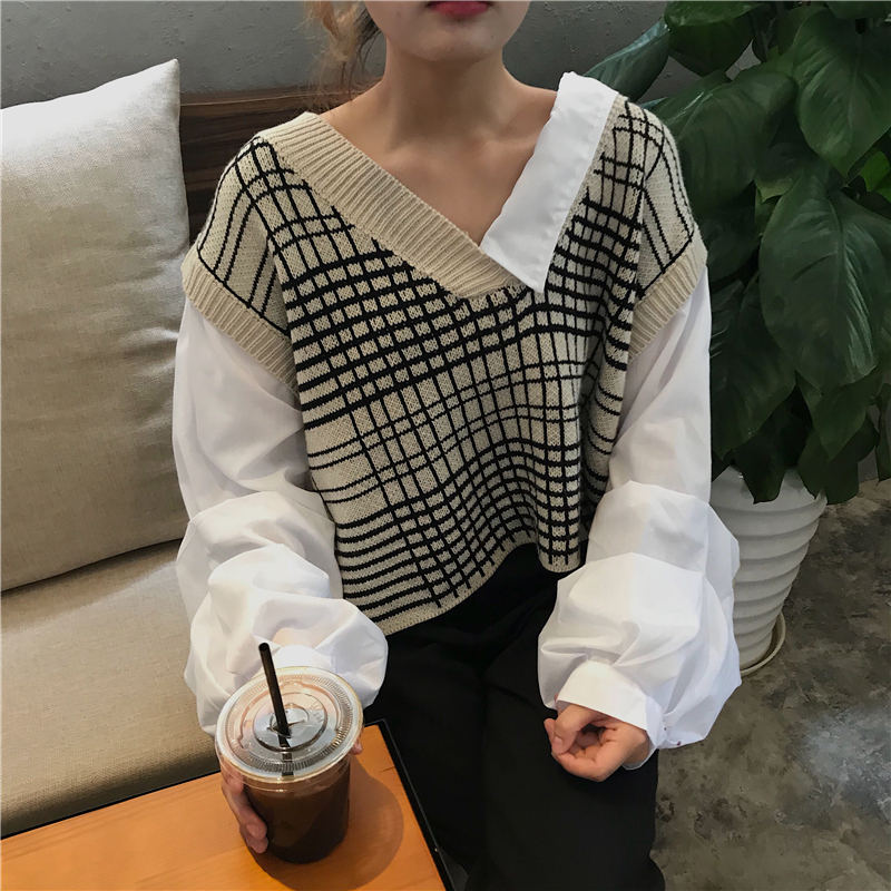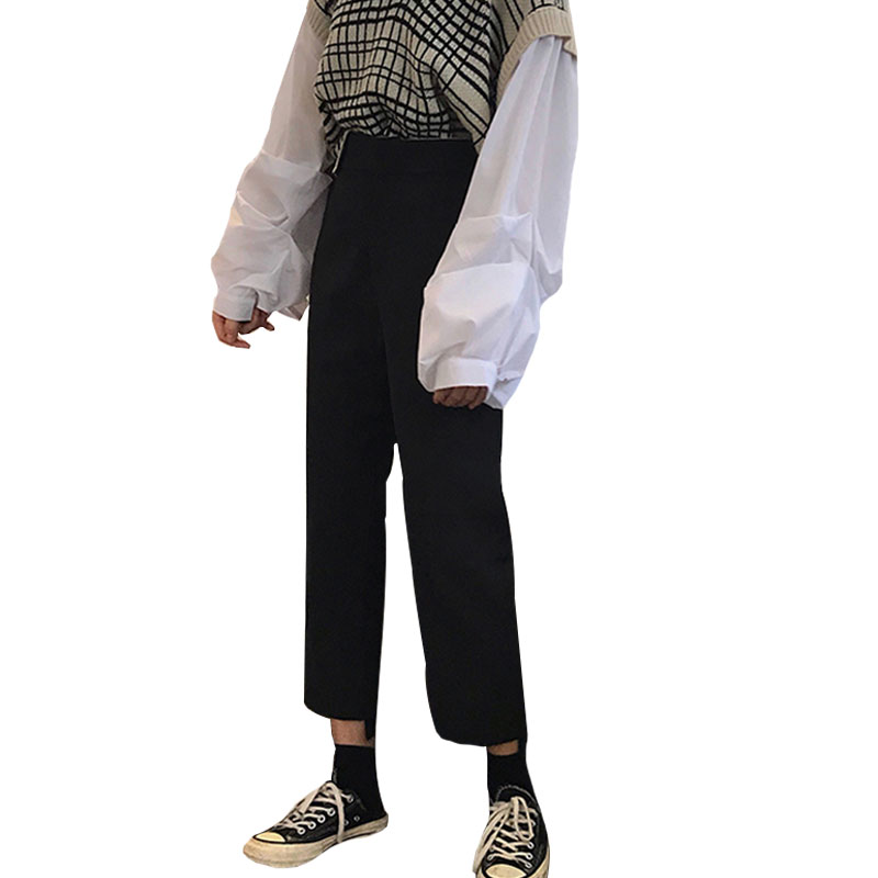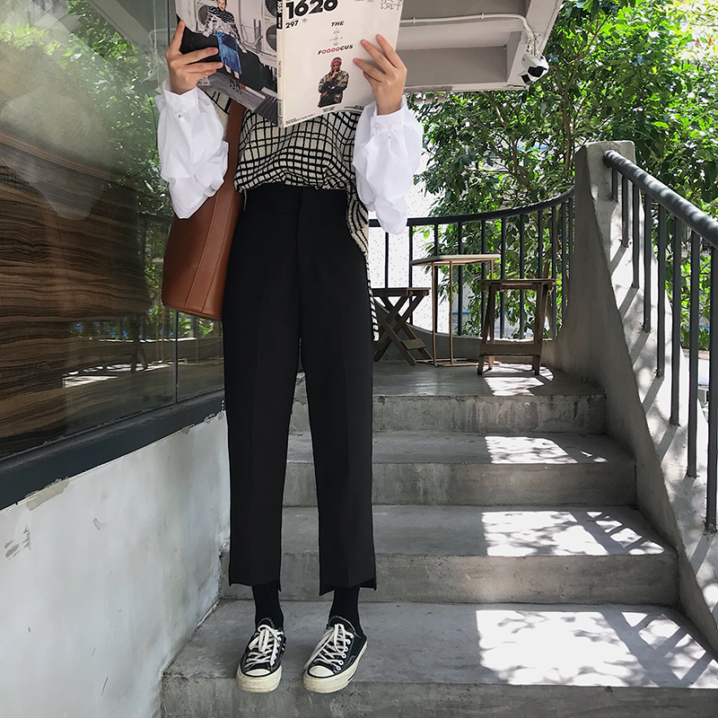 / 韓版時尚休閑套裝秋裝女裝拼接長袖毛衣+高腰西裝褲九分褲兩件套