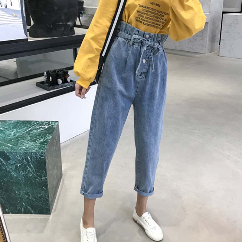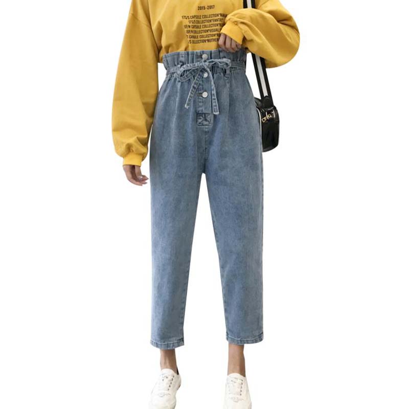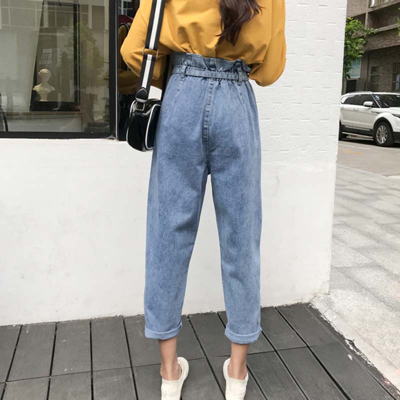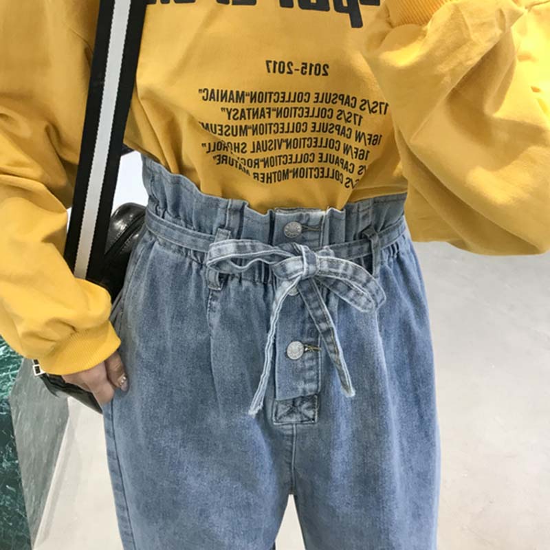 復古風單排扣牛仔褲女秋裝新款花苞高腰顯瘦長褲子休閑寬松直筒褲