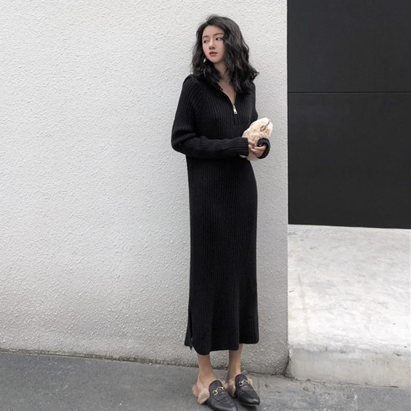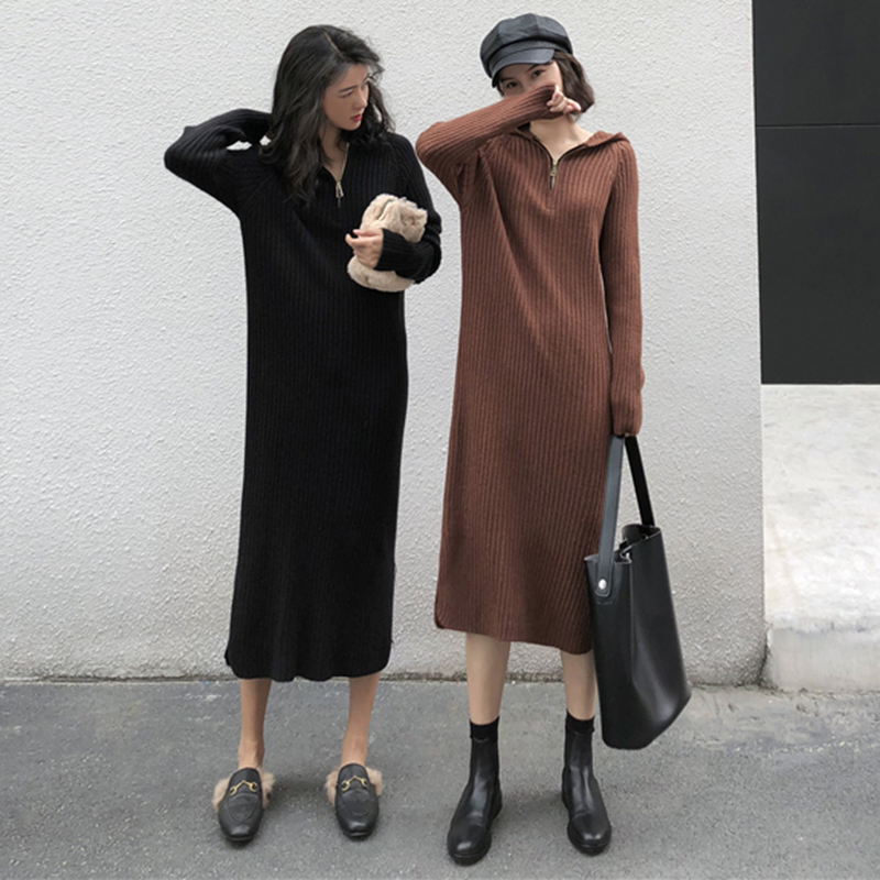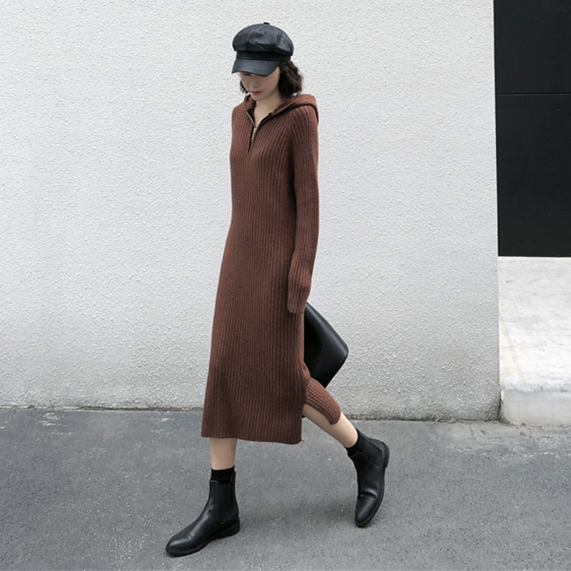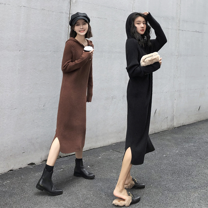 chic長款開叉針織連衣裙女秋冬裝2018新款韓版寬松長袖連帽毛衣裙