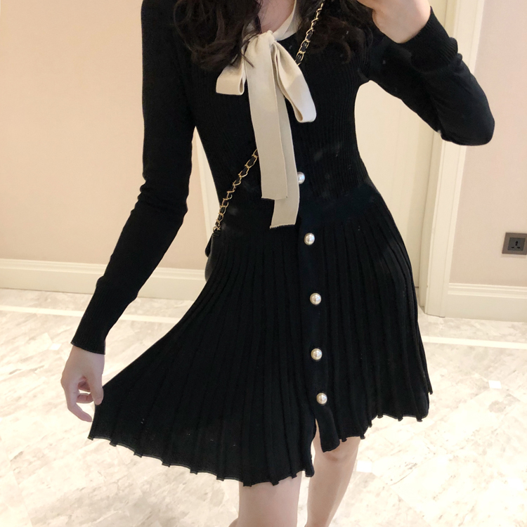 韓版時尚秋裝女2018新款氣質百搭款百褶裙針織拼接紐扣連衣裙短裙