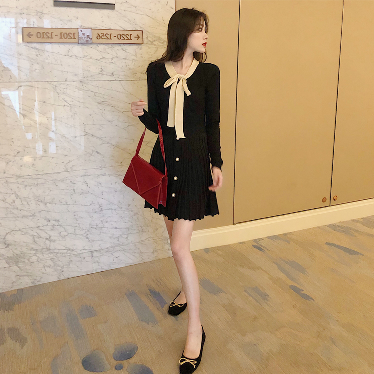 chic早秋裙子網紅同款氣質時尚短裙蝴蝶結領口收腰顯瘦長袖連衣裙