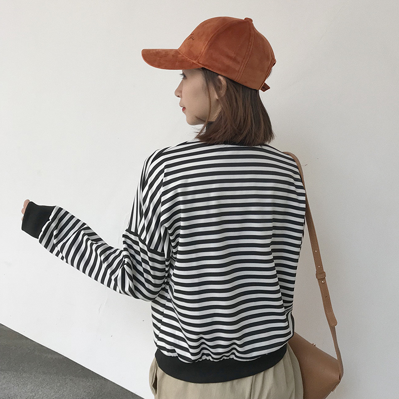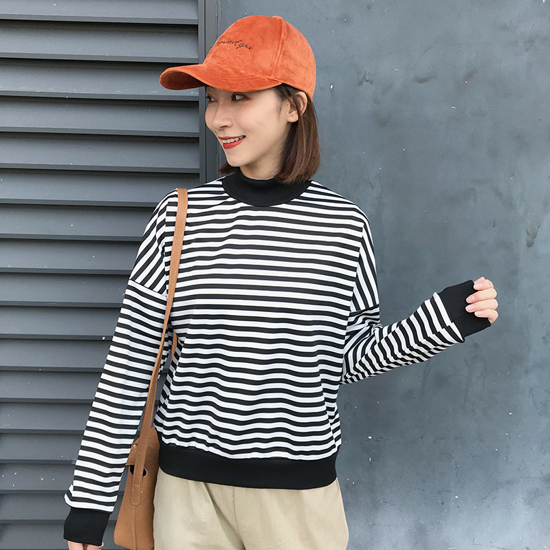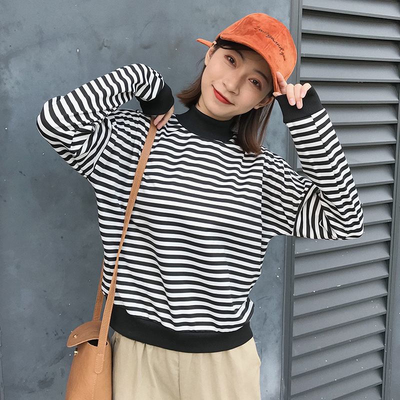 / 拼色條紋小高領打底衫女秋冬裝新款寬松顯瘦長袖上衣時尚短款T恤