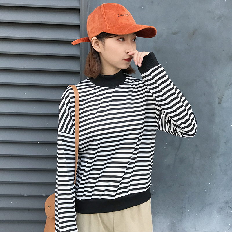 拼色條紋小高領打底衫女秋冬裝新款寬松顯瘦長袖上衣時尚短款T恤
