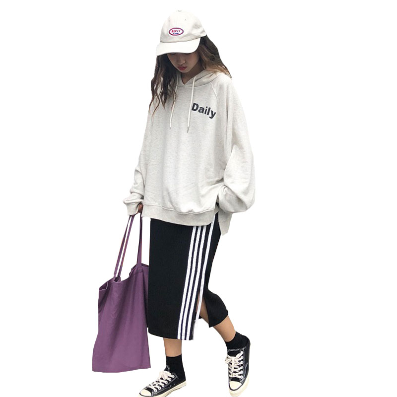 / 韓版時尚休閑套裝秋季字母連帽長袖衛衣+條紋開叉半身裙兩件套女