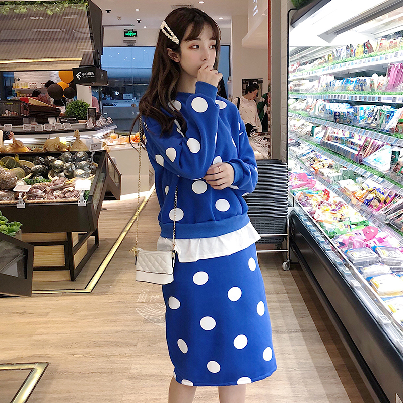 / 御姐套裝女秋冬新款波點復古風拼接衛衣外套高腰顯瘦開叉半身裙子