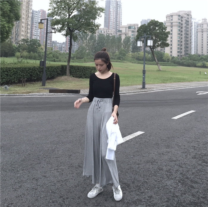 韓版女裝秋裝女2018新款簡約寬松顯瘦針織拖地直筒闊腿長褲休閑褲