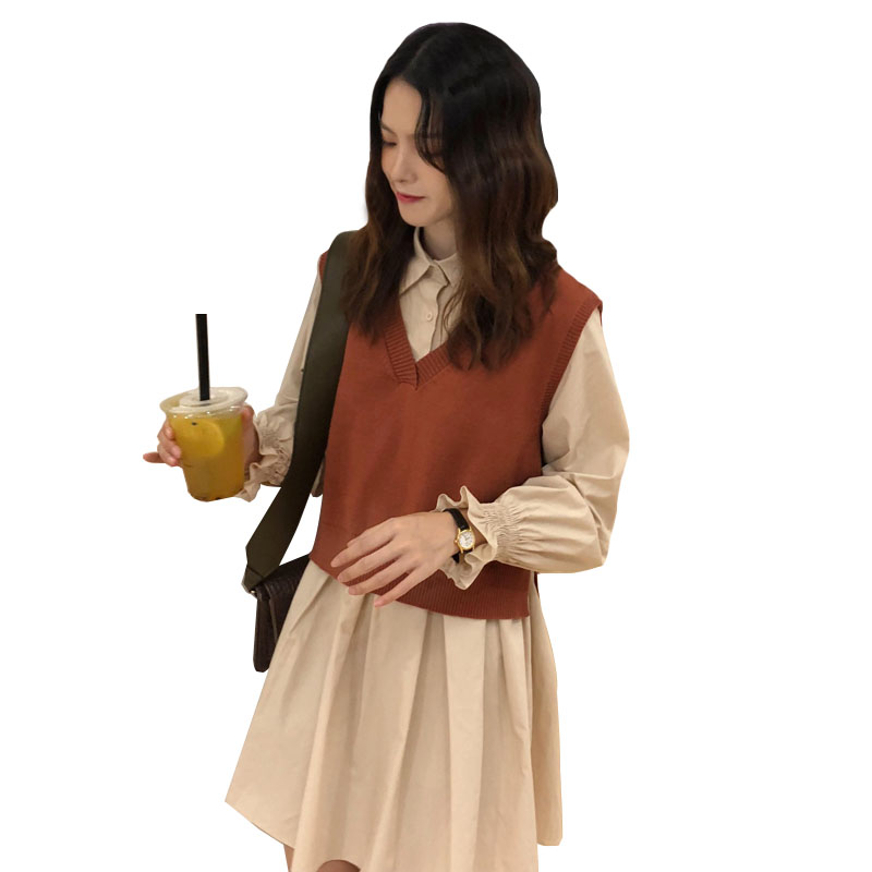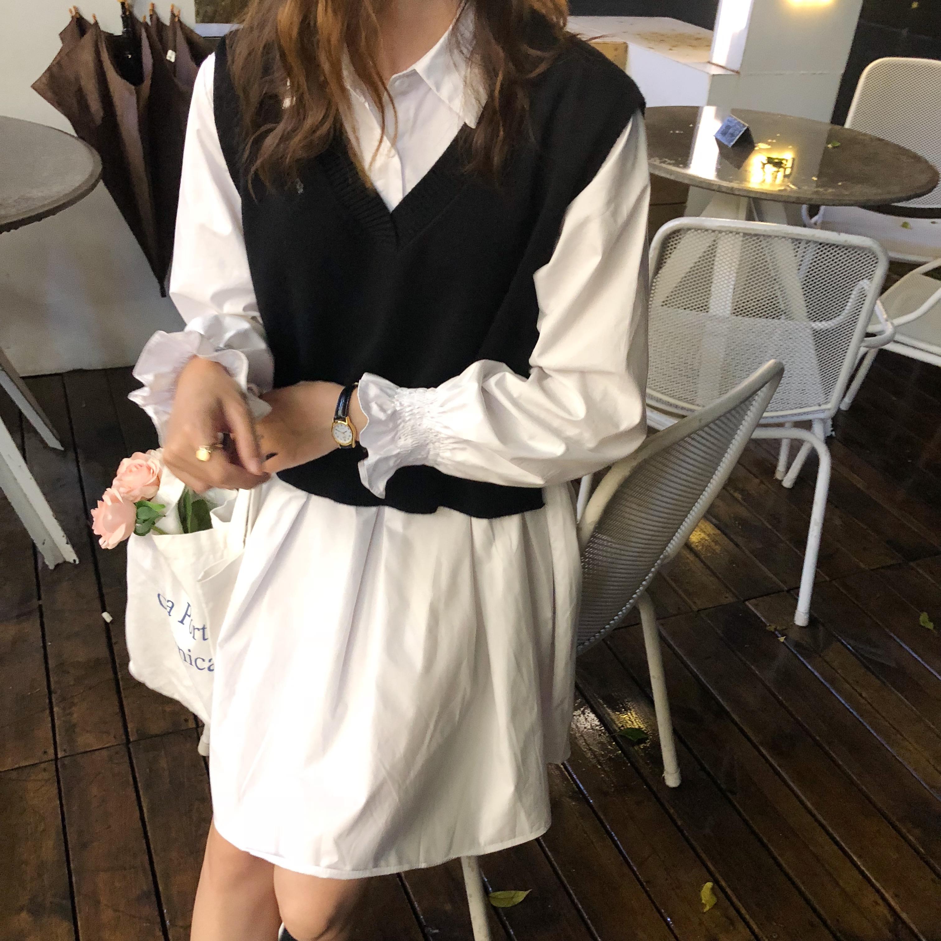 / 韓版時尚休閑套裝秋季氣質長袖襯衫連衣裙+針織背心馬甲兩件套女