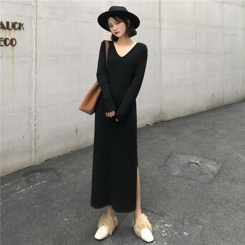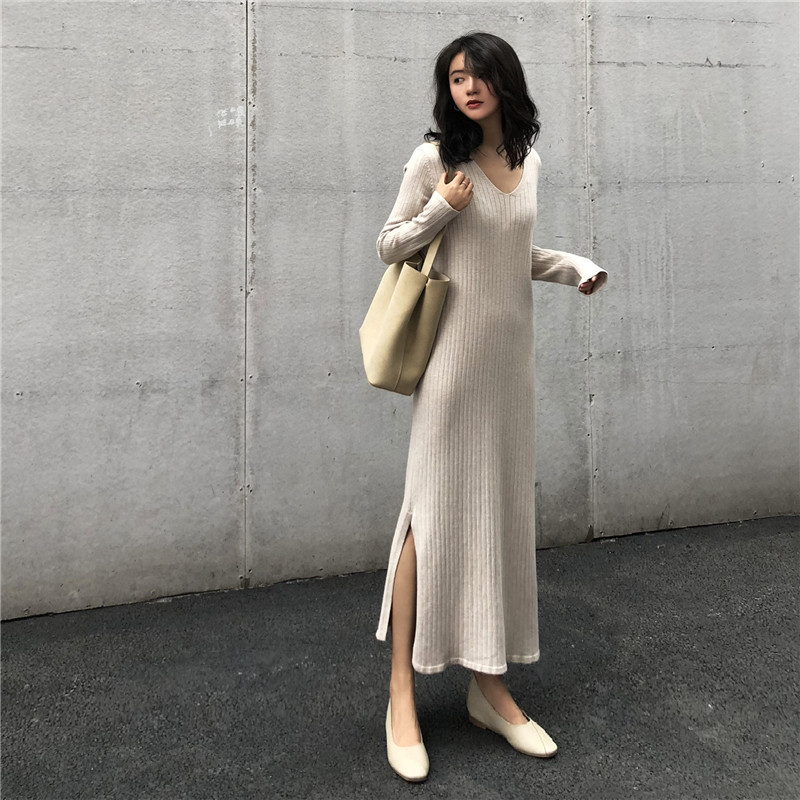 2018秋冬新款韓版坑條針織時尚長款v領寬松連衣裙側開叉打底裙女