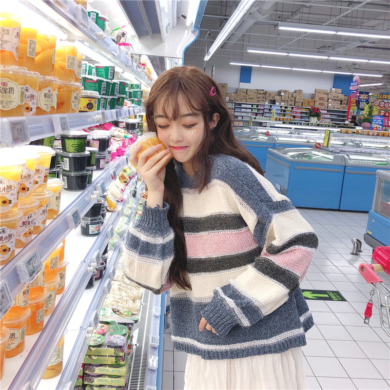 / 2018新款秋冬女裝韓版彩色條紋慵懶風寬松網紅套頭針織衫毛衣外套