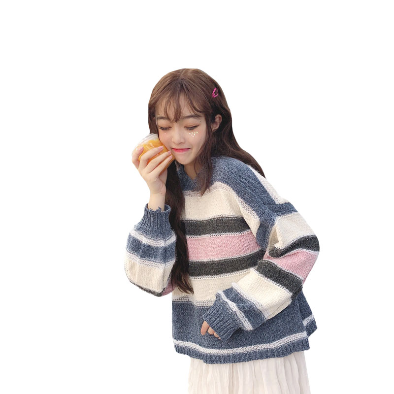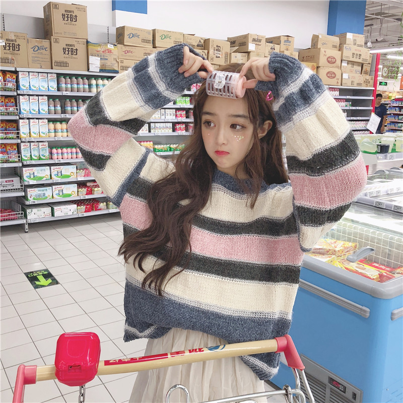 2018新款秋冬女裝韓版彩色條紋慵懶風寬松網紅套頭針織衫毛衣外套