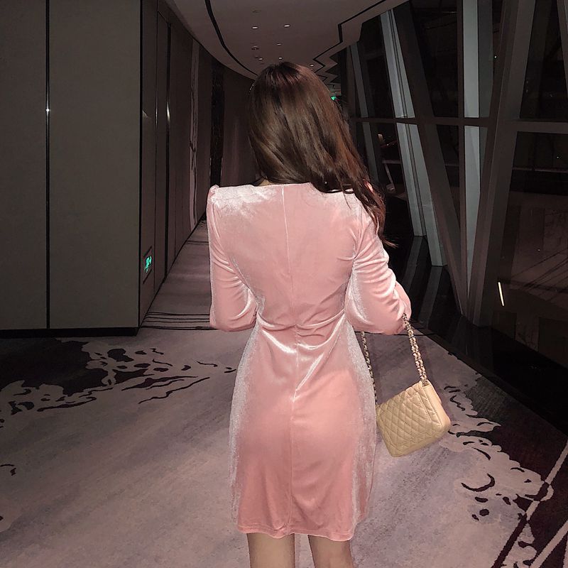 / 晚晚風新款韓版秋季女神范單排扣蝴蝶結收腰顯瘦長袖絲絨連衣裙潮