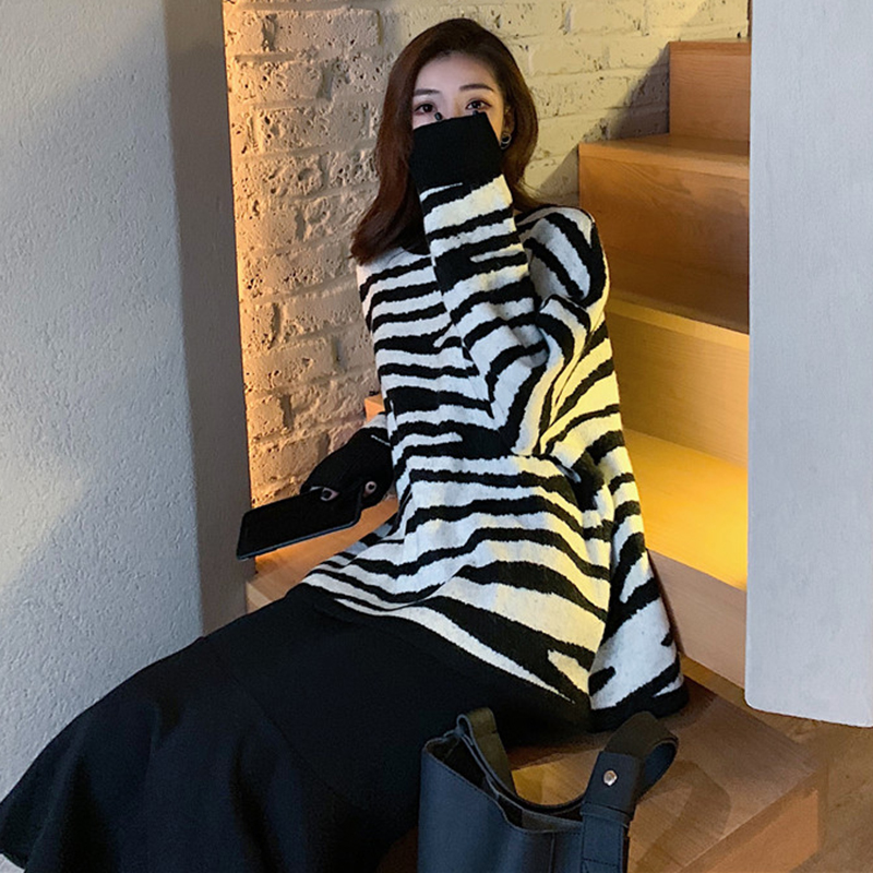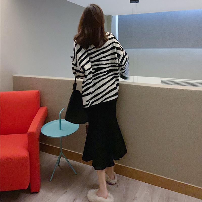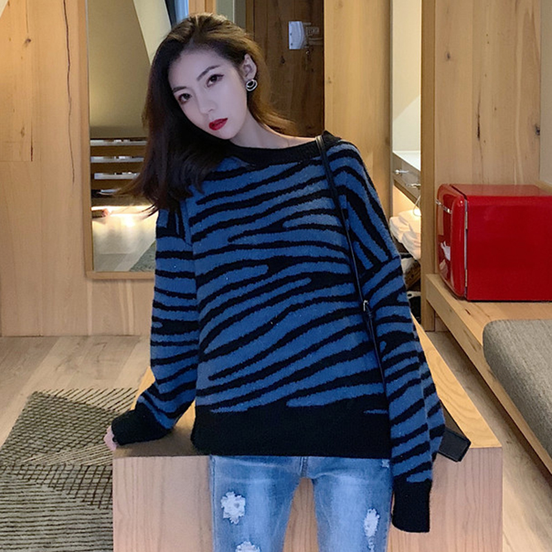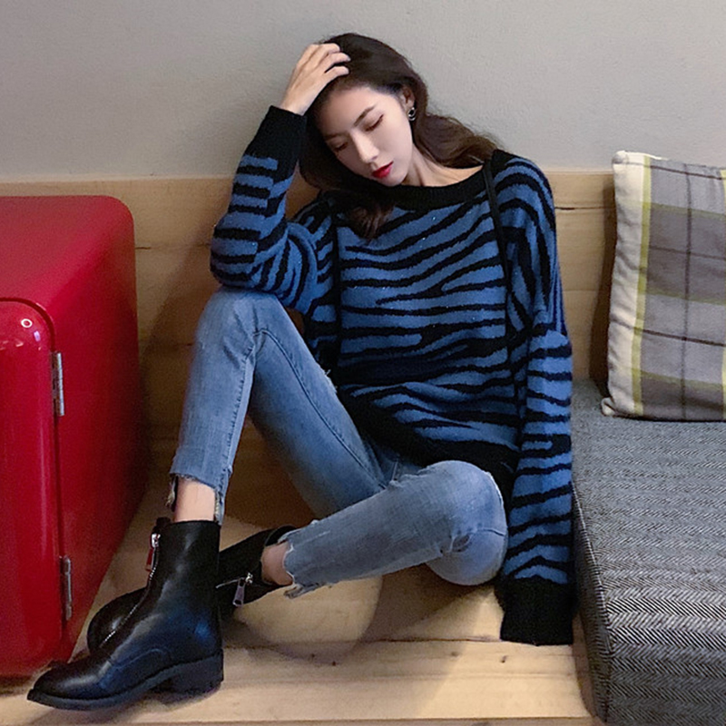慵懶風撞色條紋毛衣外套女秋冬裝2018新款學生韓版寬松套頭針織衫