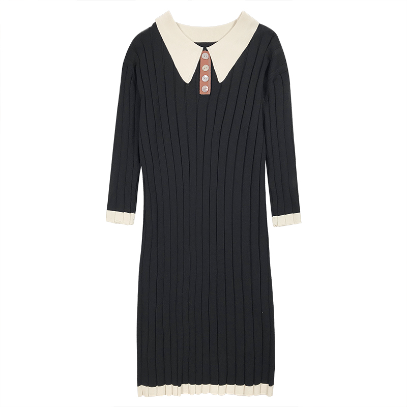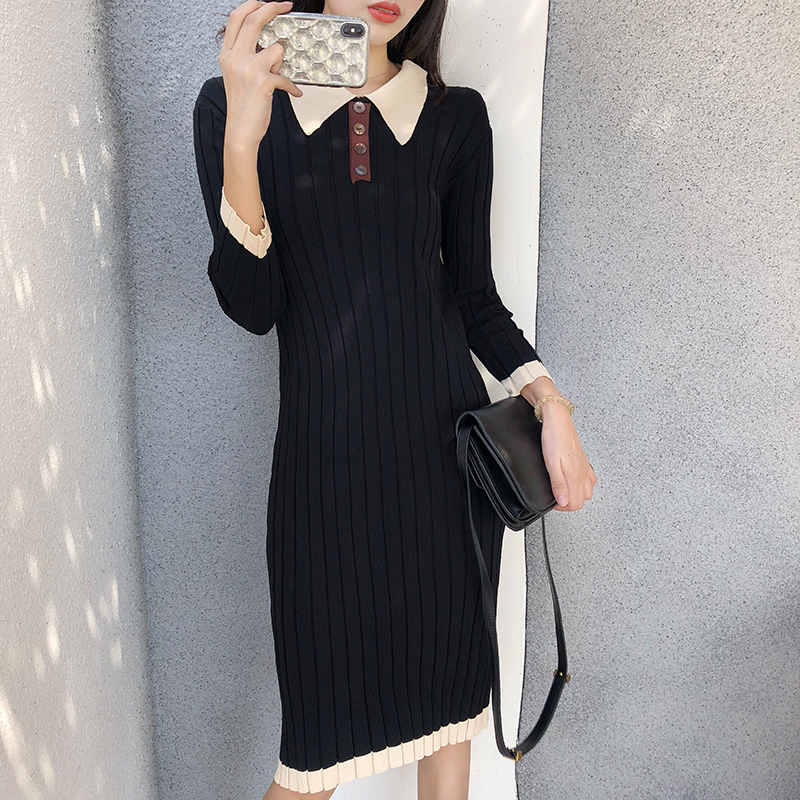 Polo領中長款裙子女冬裝2018新款韓版氣質修身黑色顯瘦針織連衣裙