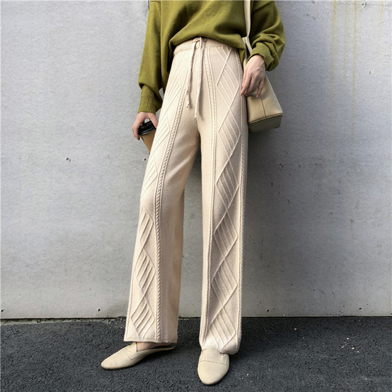 紋理針織九分褲秋裝女2018新款韓版松緊高腰黑色休閑寬松闊腿褲子