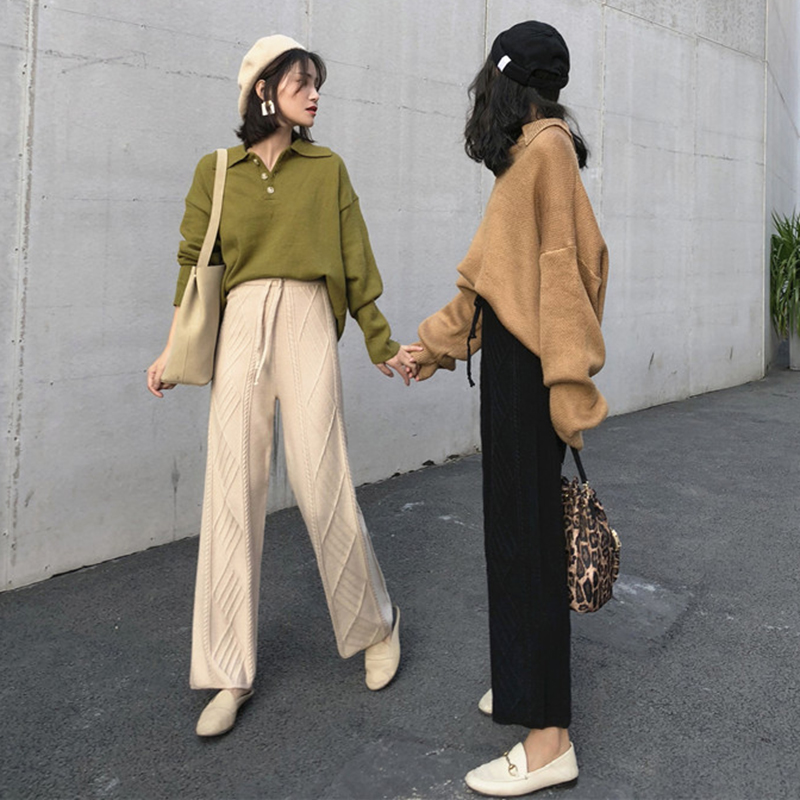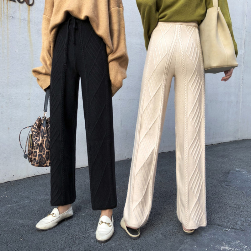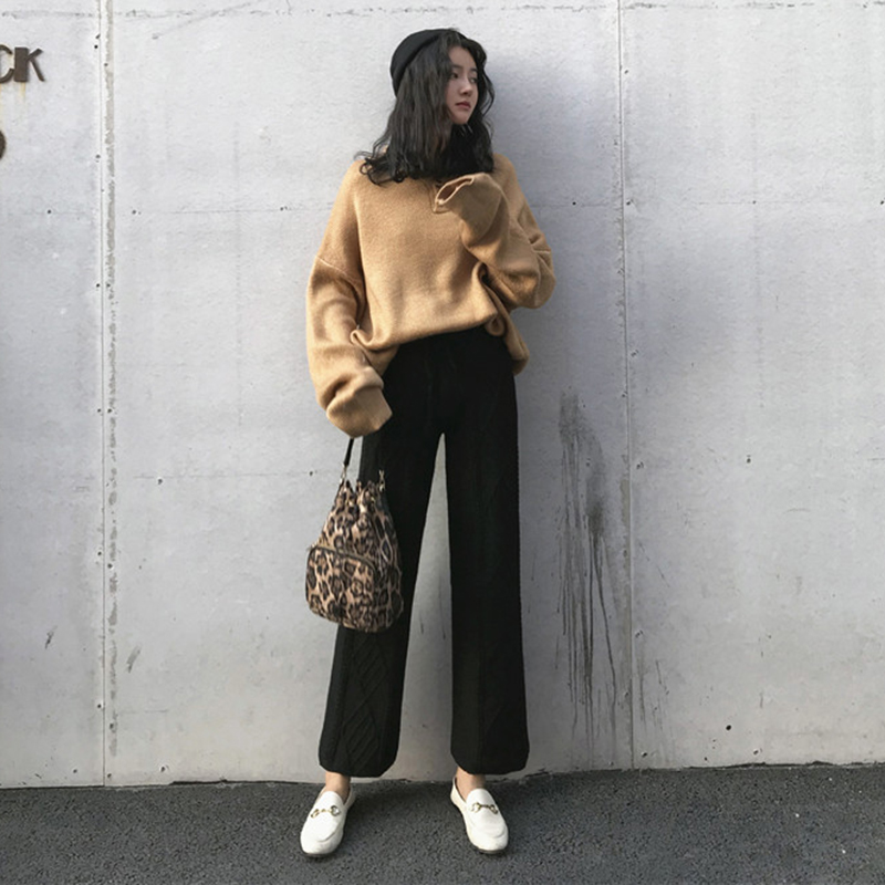 / 紋理針織九分褲秋裝女2018新款韓版松緊高腰黑色休閑寬松闊腿褲子
