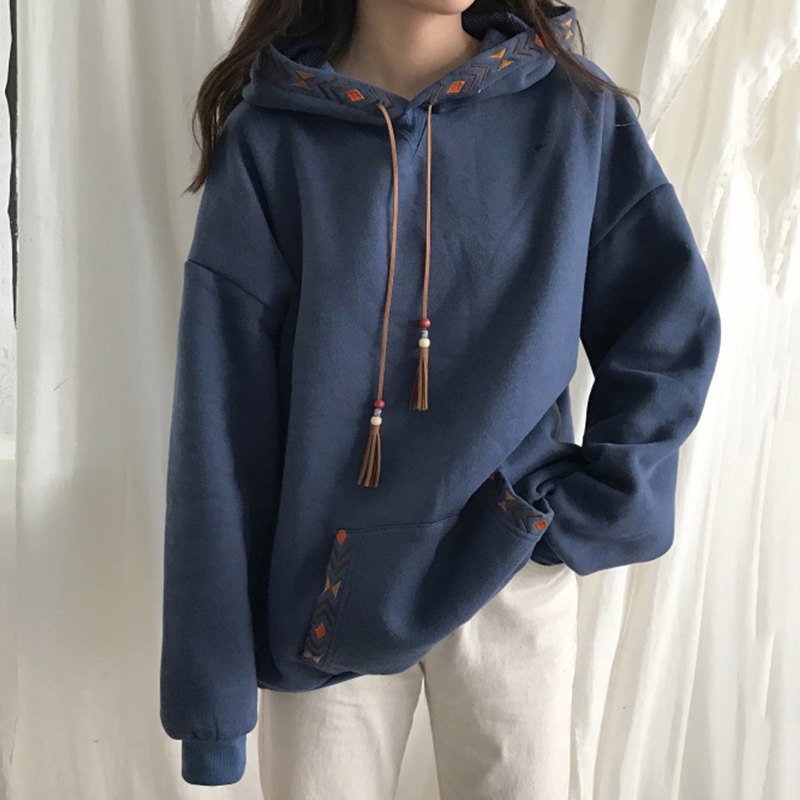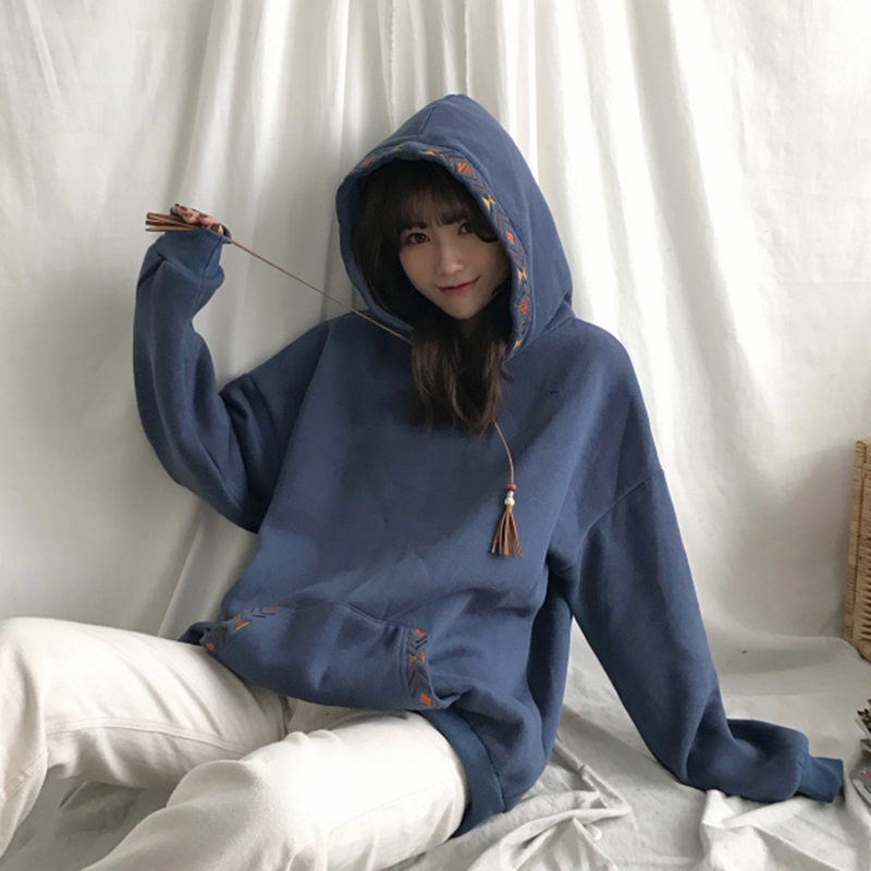 秋冬女裝2018新款韓版寬松刺繡套頭連帽衛衣少女加厚長袖外套上衣