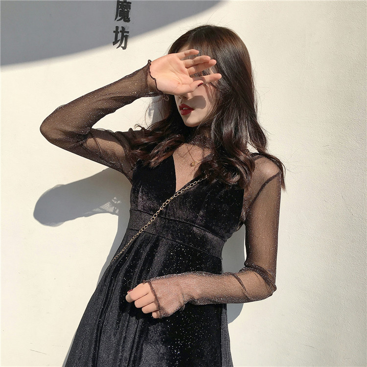 2018新款韓版氣質女人味深V領絲絨吊帶連衣裙網紗打底衫chic套裝