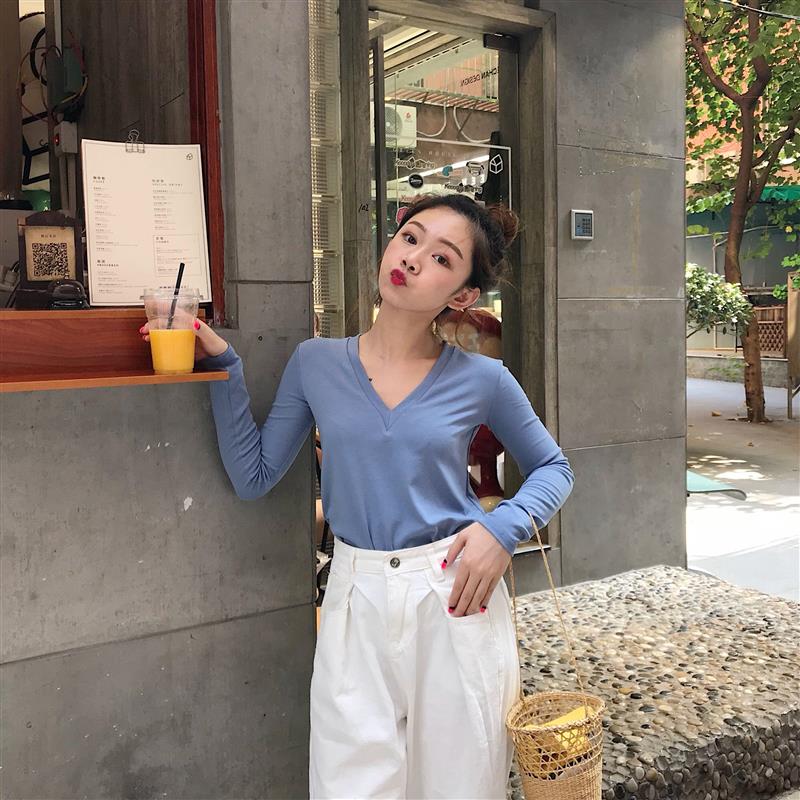 / 韓風早秋純色V領長袖修身chic上衣女T恤顯瘦簡約基礎百搭打底衫