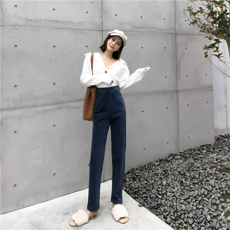 / 高腰燈芯絨褲子女秋冬2018新款寬松韓版條絨九分顯瘦哈倫褲休閑褲