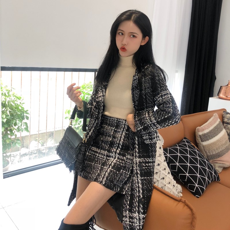 / 秋裝女2018新款格子西裝外套半身裙女+長袖針織衫+長袖網紗三件套