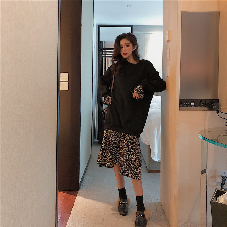 / 韓國chic風秋裝女2018新款裙子加絨百搭圓領假兩件拼接豹紋連衣裙