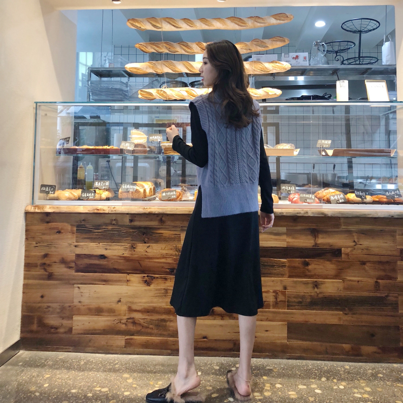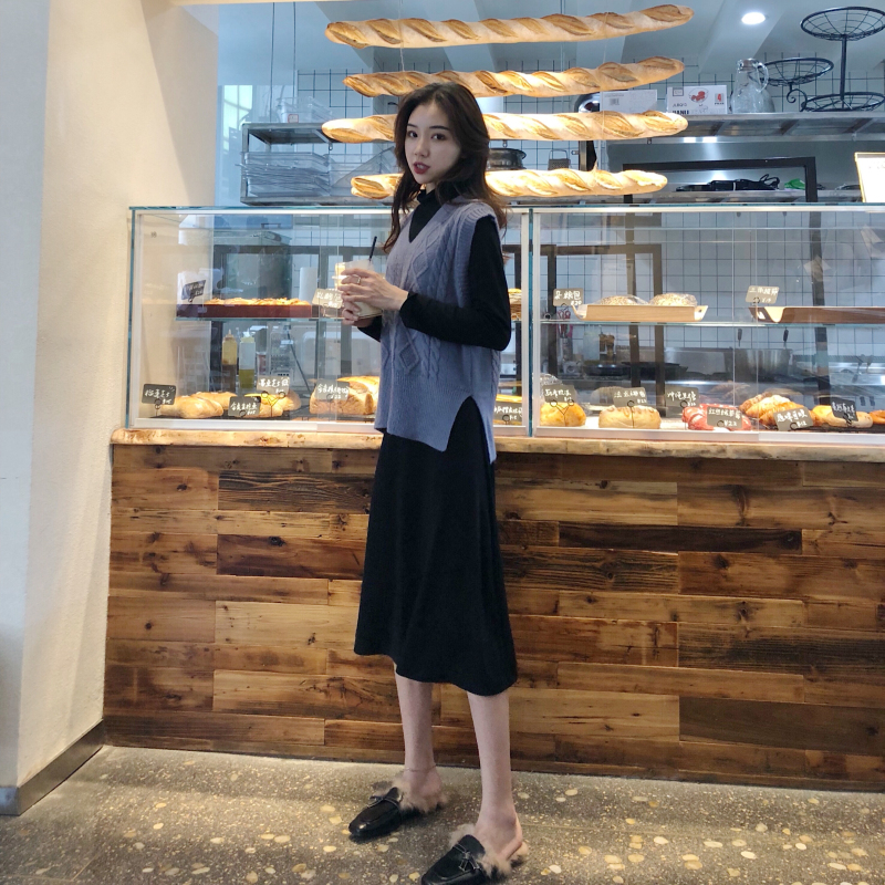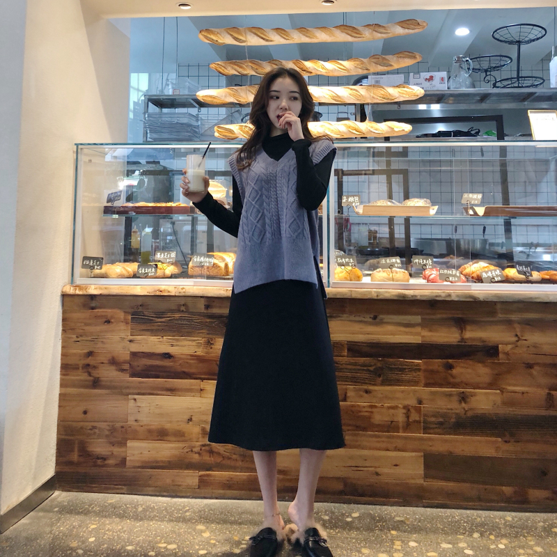 秋裝女2018新款套裝針織馬甲背心女+氣質長袖修身連衣裙兩件套潮