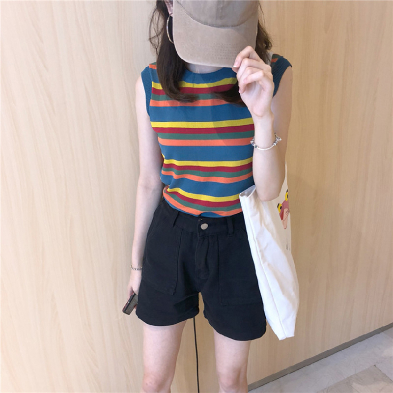 / 背心女夏季2018新款韓版彩虹條紋百搭無袖上衣圓領套頭寬松坎肩女