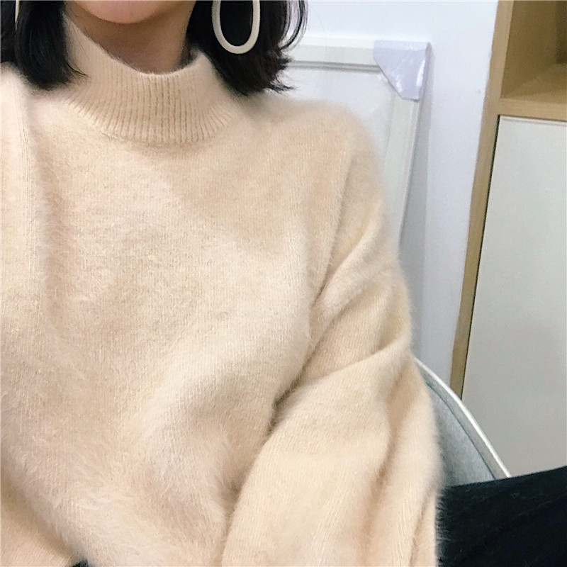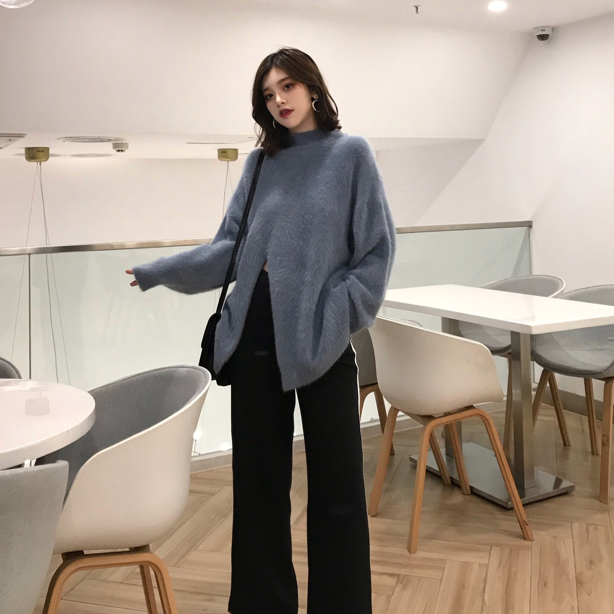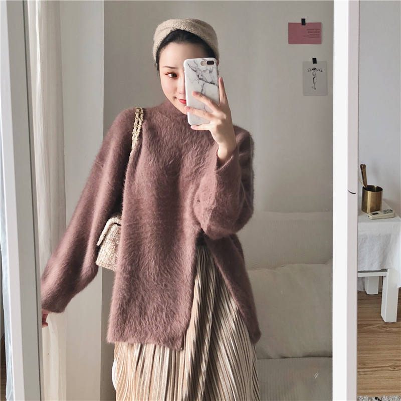 復古港味慵懶風毛衣女套頭開叉貂絨百搭半高領中長款寬松針織衫潮